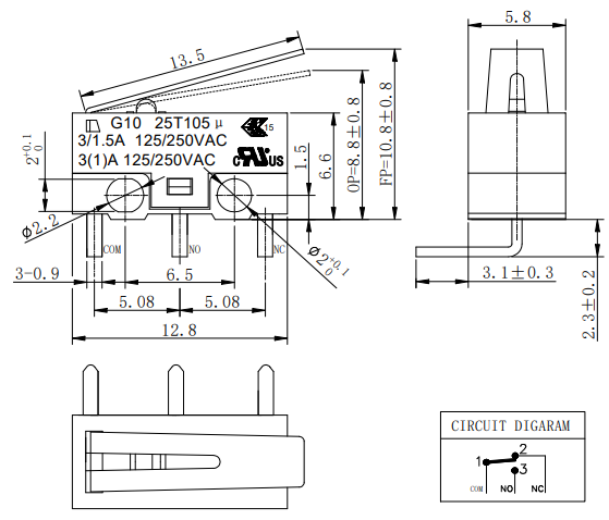 Le Micro-interrupteur 12,8 × 5,8 mm est une option moyennement compacte et économique. Ses principaux avantages incluent : une taille qui