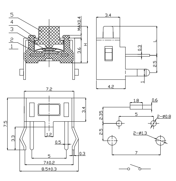 Mini interrupteur tactile 7,2 mm x 3,4 mm avec support